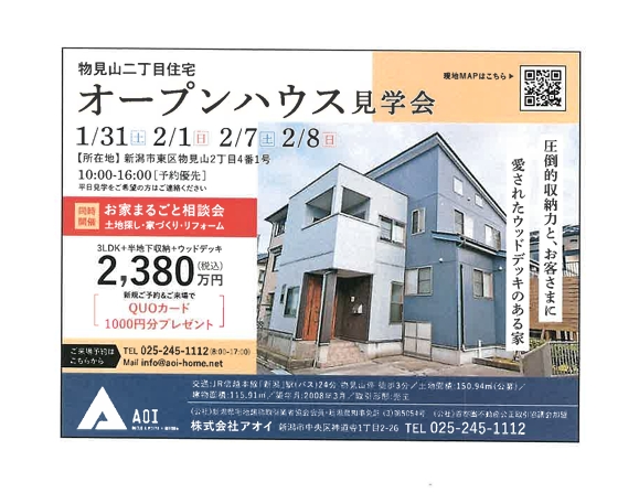 【オープンハウス見学会】開催のお知らせ!! ♢物見山住宅 (新潟市東区物見山2丁目4番1号) ♢10:00~16:00 (ご予約優先、予約なしの方も大歓迎!!) ♢1/31(土)・2/1(日)・2/7(土)・2/8(日) 下記のカレンダーより青〇の日にちからご予約承っております。 お手数ではございますが、ご予約希望日を弊社ホームページお問い合わせメールからか、 弊社までお電話をお願いいたします。 たくさんのお問い合わせお待ちしております (^^♪